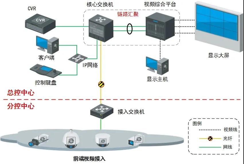 總控中心:負責對分控中心分散區域高清監控點的接入、顯示、存儲、設置等;主要部署核心交換機、視頻綜合平臺、大屏、云存儲、客戶端、平臺、視頻質量診斷服務器等。